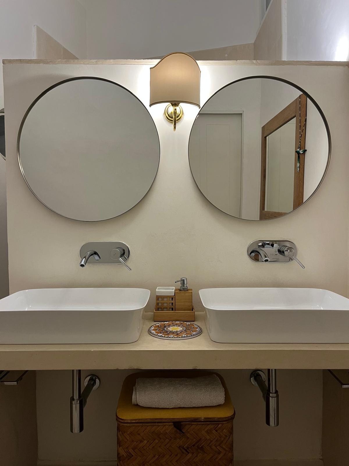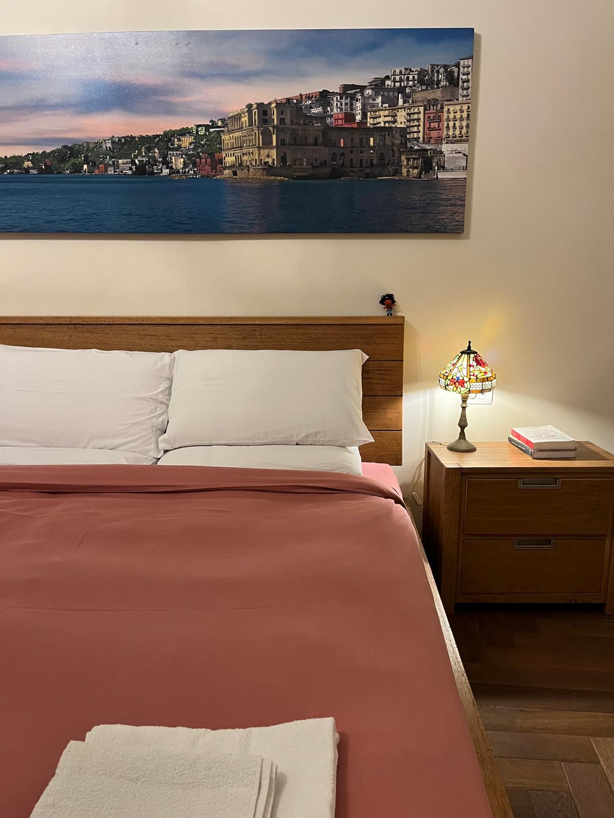 Il bagno è caratterizzato da doppio lavandino, vasca da bagno oltre che spaziosa doccia dotata di cromoterapia. Una piccola finestra ed un oblò scrutano il castel sant’Elmo conferendo all’ambiente un ulteriore fascino.
